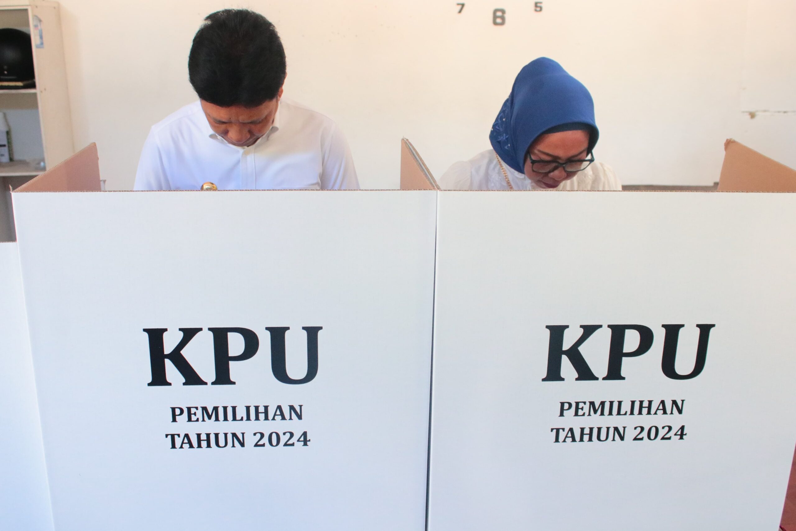 AMBON- Pj. Gubernur Maluku Sadali Ie bersama Ibu Nita Sadali menggunakan haknya dalam pemilihan kepala daerah di Tempat Pemungutan Suara (TPS) 042, Kelurahan Batu Merah, Kecamatan Sirimau, Rabu, 27 November 2024.