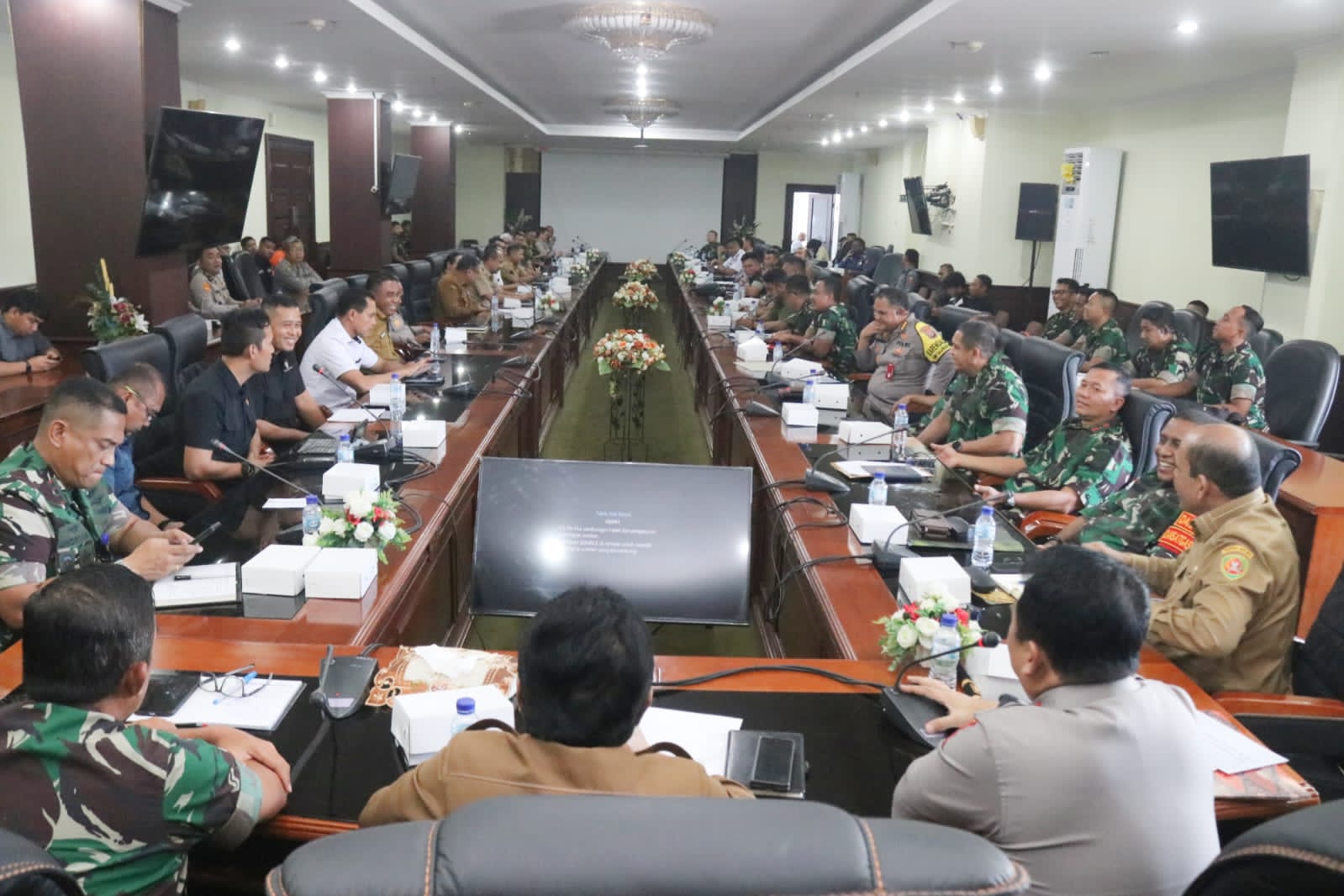 Rapat dihadiri langsung oleh Penjabat Gubernur Maluku, Sadali Ie, Kapolda Maluku Irjen Pol. Eddy Sumitro Tambunan, Kasdam XV/Pattimura Brigjen TNI. Nefra Firdaus Lubis, Binda Maluku, Pejabat TNI/Polri, Pimpinan Lembaga Vertikal dan sejumlah Pimpinan OPD Lingkup Pemprov Maluku terkait. (Biro Administrasi Pimpinan Setda Maluku)