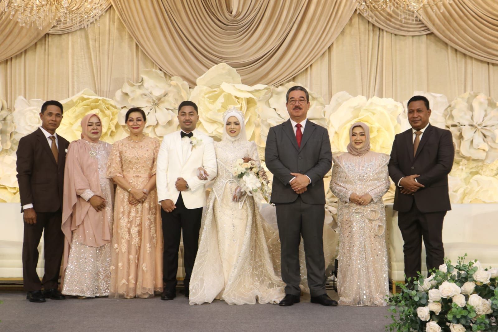Dalam suasana hangat dan penuh keakraban, Gubernur juga melontarkan pujian kepada kedua mempelai dan menutup sambutannya dengan pesan ringan yang disambut tawa serta tepuk tangan para undangan.