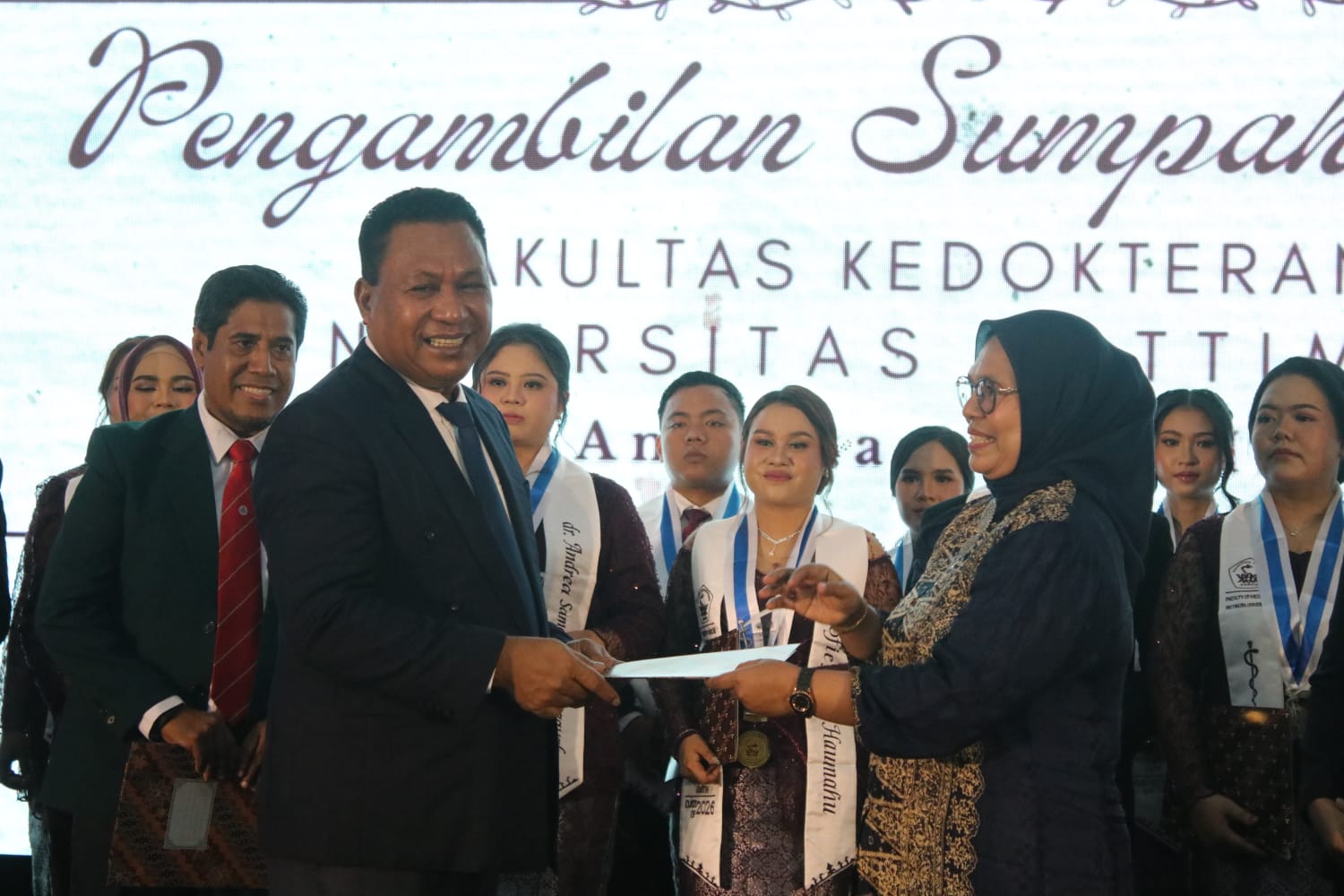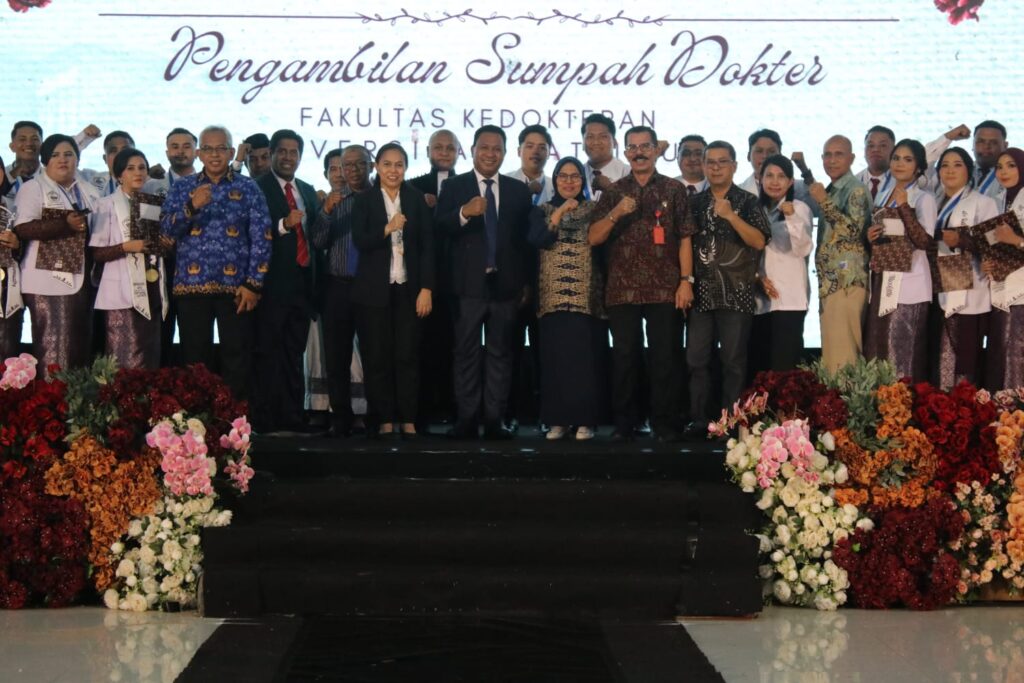 AMBON – Wakil Gubernur Maluku, Abdullah Vanath, menghadiri acara Pengambilan Sumpah dan Pelantikan 71 Dokter Baru lulusan ke-37 Fakultas Kedokteran Universitas Pattimura (Unpatti) Ambon, yang digelar di Gedung Islamic Center Ambon, Kamis (5/2/2026). Prosesi pelantikan dipimpin langsung oleh Dekan Fakultas Kedokteran Unpatti, dr. Farah Christina Noya.