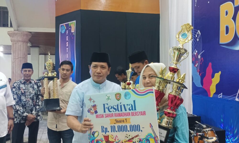 Ketgam: Sekretais Daerah Maluku, Ir. Sadali Ie, M.Si, IPU menyerahkan piala bergilir juara I Festival Musik Sahur Ramadhan Bersyair, Sabtu (6/4/2024). Foto, Ist
