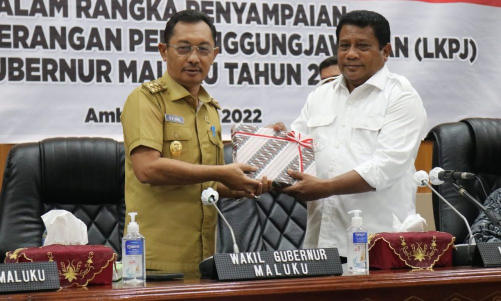 Ketgam: Wagub Maluku, Barnabas Nathaniel Orno menyerahkan LKPj Gubernur Tahun 2021 kepada DPRD Provinsi Maluku dalam rapat paripurna DPRD, yang diterima Ketua DPRD Maluku, Lucky Wattimury,...