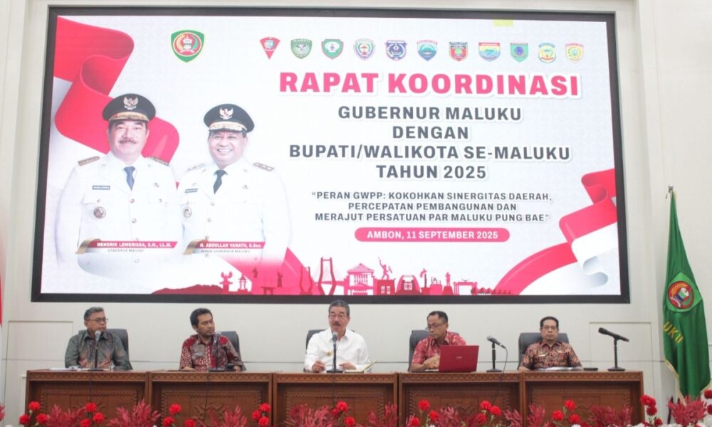 AMBON- Gubernur Maluku, Hendrik Lewerissa, membuka rapat koordinasi (rakor) bersama seluruh bupati dan wali kota se-Maluku di Aula Lantai VII Kantor Gubernur Maluku, Kamis (10/9/2025). Rakor...