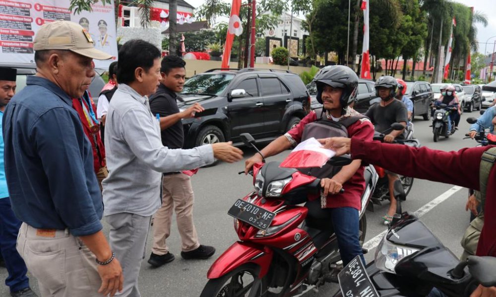 Ketgam: Pj. Sekda Maluku, Sadali ie membagikan Bendera Merah Putih kepada warga Kota Amhon, dalam rangka menyemarakkan HUT Kemerdekaan RI ke-77 tahun 2022, Jumat (5/7/2022). (Dok,...